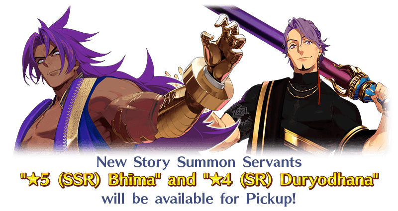 About Featured Servants: * The following Servant(s) will be summonable, even if they have not yet been added to Story Summon through story progression. In addition, they will be added to Story Summon for Masters who have cleared "Ordeal Call I: Zero Compass Inner Domain, Paper Moon" starting from 2025-05-19 01:00 PDT (GMT -7). No other Servants added to Story Summon through story progression will be summonable. - ★5 (SSR) Bhīma - ★4 (SR) Duryodhana