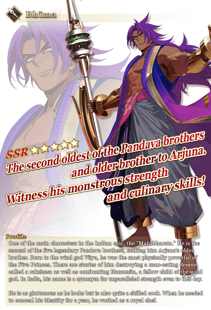 To commemorate the release of "Ordeal Call I: Zero Compass Inner Domain, Paper Moon", new Servants "★5 (SSR) Bhīma" and "★4 (SR) Duryodhana" will be available for Pickup!