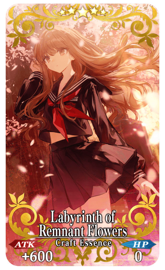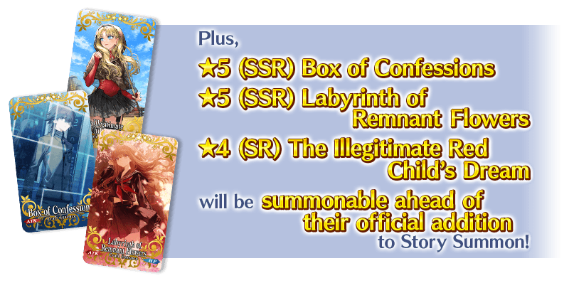 Early Release Permanent Craft Essences - ★5 (SSR) Box of Confessions - ★5 (SSR) Labyrinth of Remnant Flowers - ★4 (SR) The Illegitimate Red Child's Dream