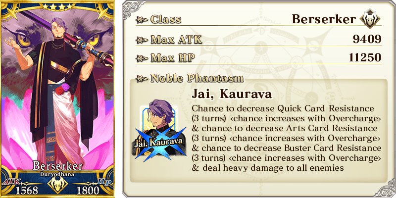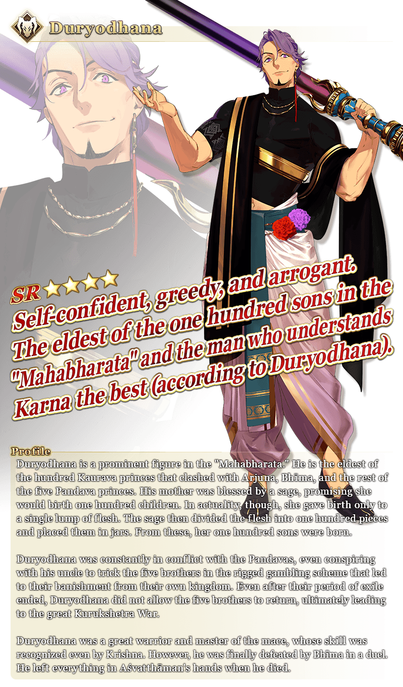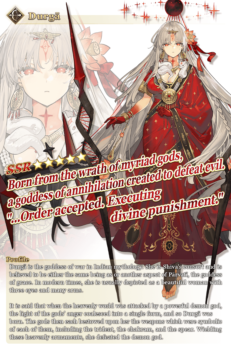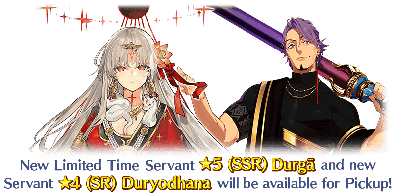 About Featured Servants: * The following Servant(s) will not be added to Story Summon after the Pickup Summon period ends. - ★5 (SSR) Durgā * The following Servant(s) will be summonable, even if they have not yet been added to Story Summon through story progression. No other Servants added to Story Summon through story progression will be summonable. In addition, the following Servant(s) will continue to be available through Story Summon after the Pickup Summon period ends. - ★4 (SR) Duryodhana
