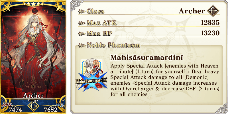 * The Noble Phantasm name and animations displayed for ★5 (SSR) Durgā will change when her battle sprite is set to Stage 3 Ascension.