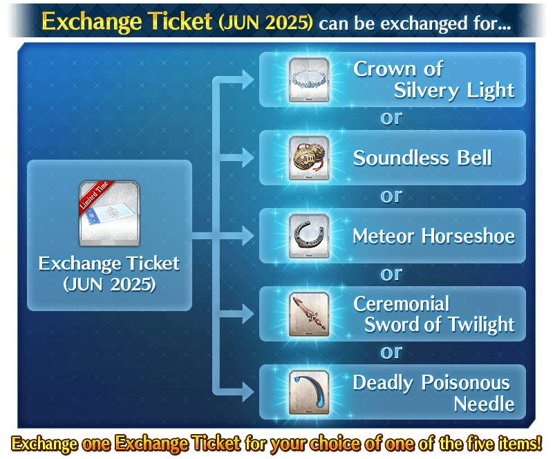 The "Exchange Ticket (JUN 2025)" available as a daily login bonus and daily mission rewards will be exchangeable for the following items.