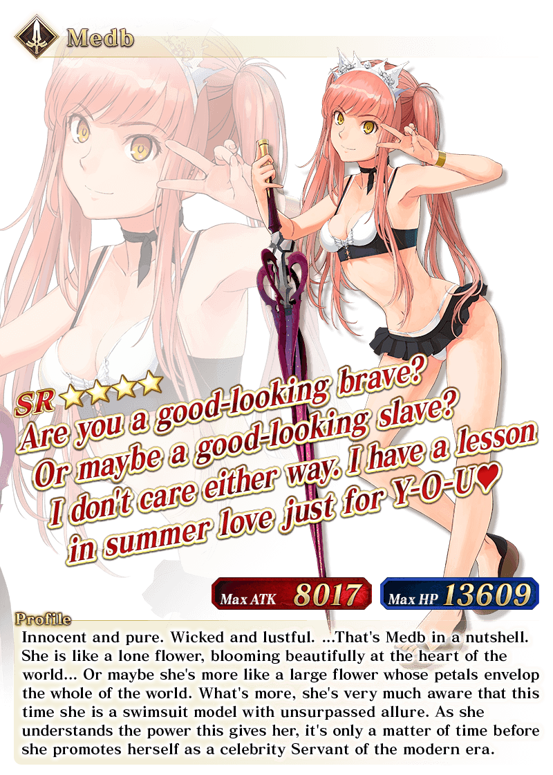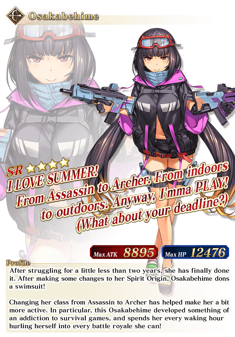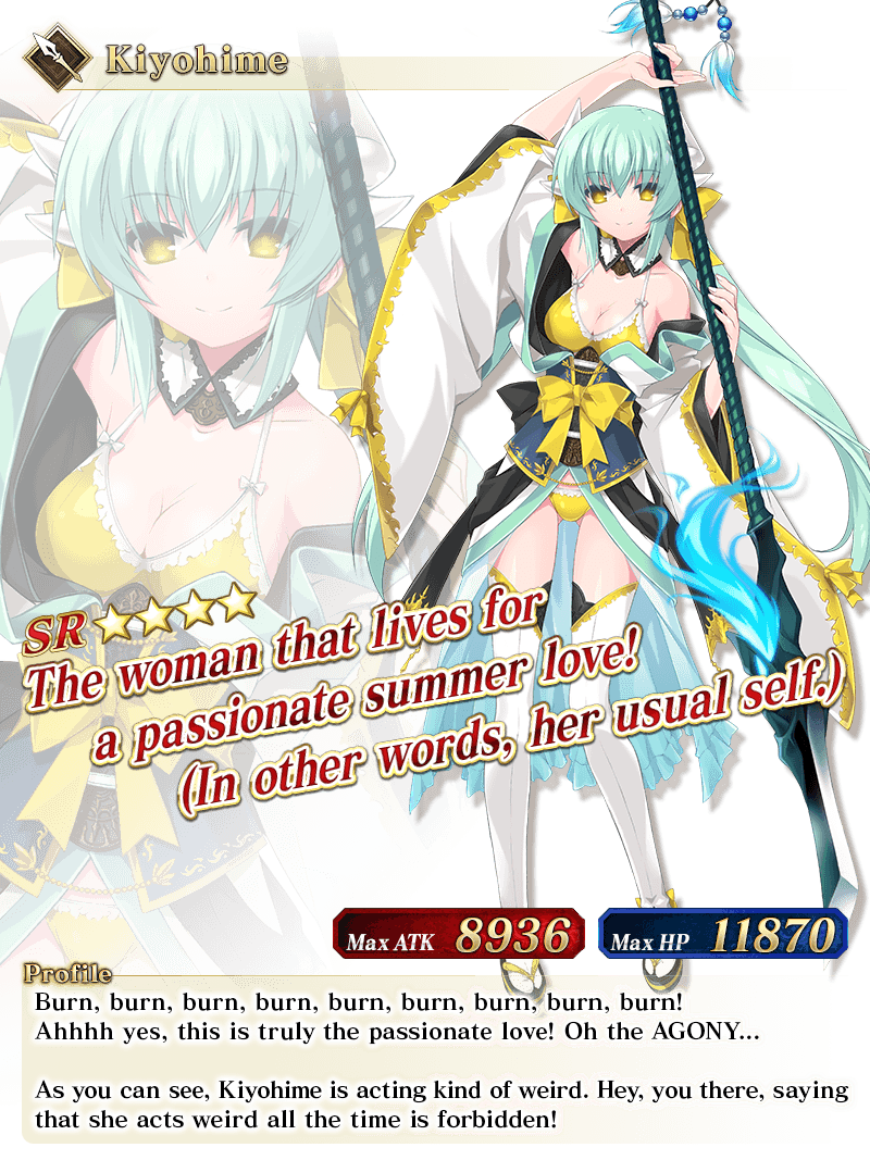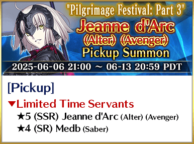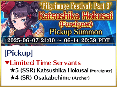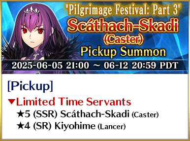 About Featured Servants: * The following Limited Time Servant(s) will only be summonable from the Summon Lineup(s) where they are featured as a Pickup Servant. In addition, they will not be added to Story Summon after the Pickup Summon period ends. - ★5 (SSR) Scáthach-Skadi (Caster) - ★5 (SSR) Jeanne d'Arc (Alter) (Avenger) - ★5 (SSR) Katsushika Hokusai (Foreigner) - ★4 (SR) Medb (Saber) - ★4 (SR) Osakabehime (Archer) - ★4 (SR) Kiyohime (Lancer) * Servants added to Story Summon through story progression will not be summonable. Please be sure to confirm the lineup before summoning.