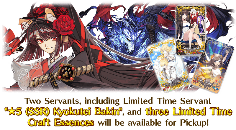 To celebrate the Limited Time Event "Mystic Eyes Symphony - The Bewitching Forest and Beautiful Footprints", two Servants, including a Limited Time Servant, and three Limited Time Craft Essences will be available for Pickup! * All Masters will be able to participate in the "Mystic Eyes Symphony Kyokutei Bakin Pickup Summon", regardless of story progression.