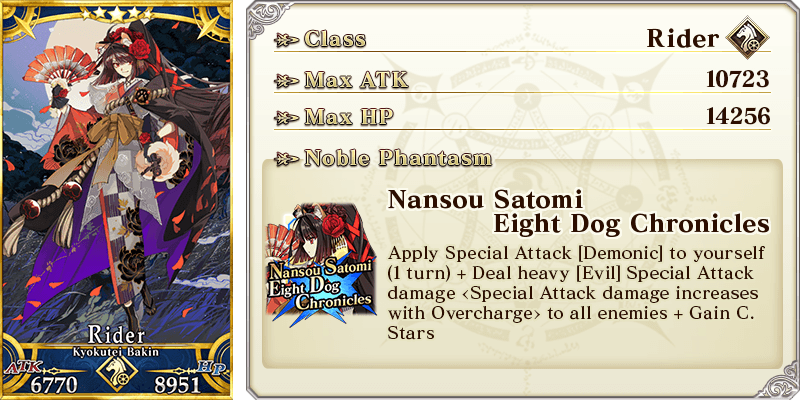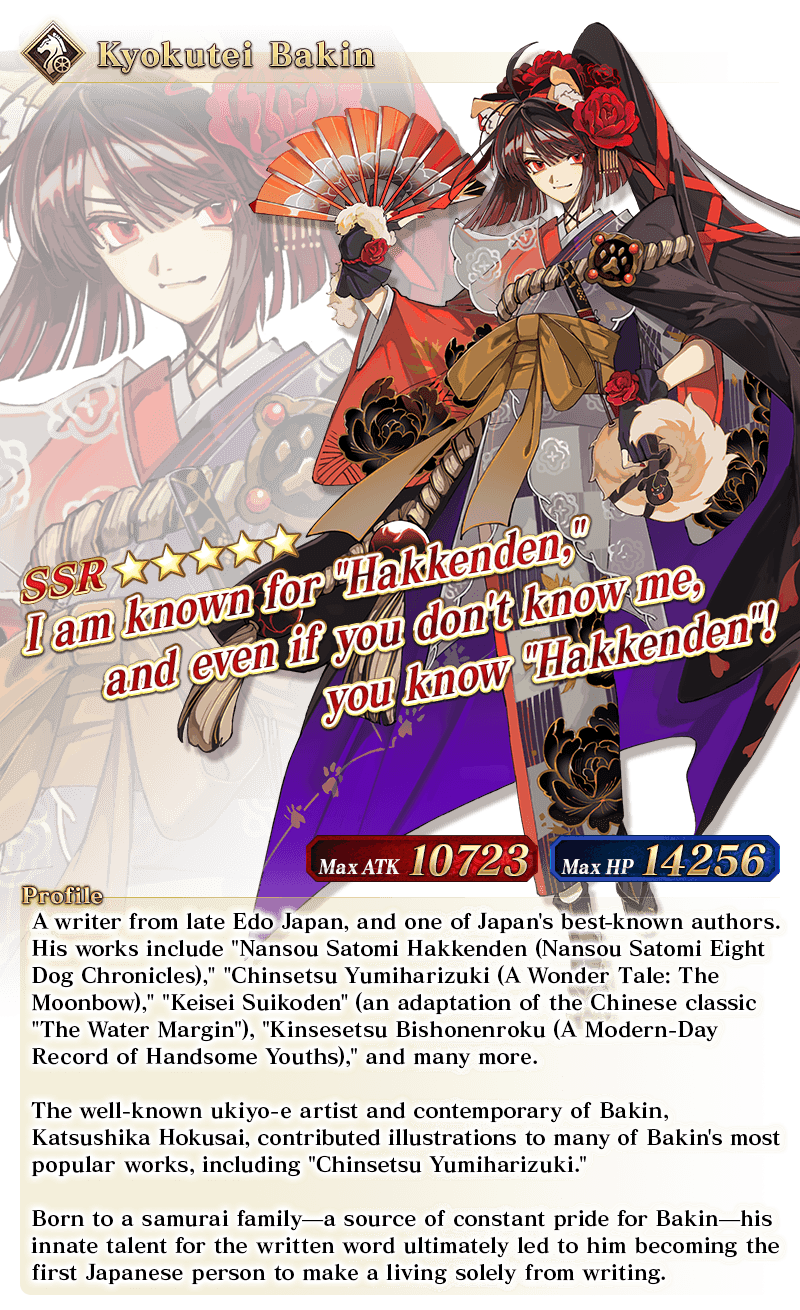 About Featured Servants: * The following Servant(s) will not be added to Story Summon after the Pickup Summon period ends. - ★5 (SSR) Kyokutei Bakin * The following Servant(s) will continue to be available through Story Summon after the Pickup Summon period ends. - ★4 (SR) Hessian Lobo (Avenger of Shinjuku) * The name displayed for Servants whose True Names are hidden will change based on story progression. In some cases, the name displayed for their Noble Phantasm will also change. * Servants added to Story Summon through story progression will not be summonable. Please be sure to confirm the lineup before summoning.