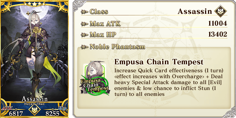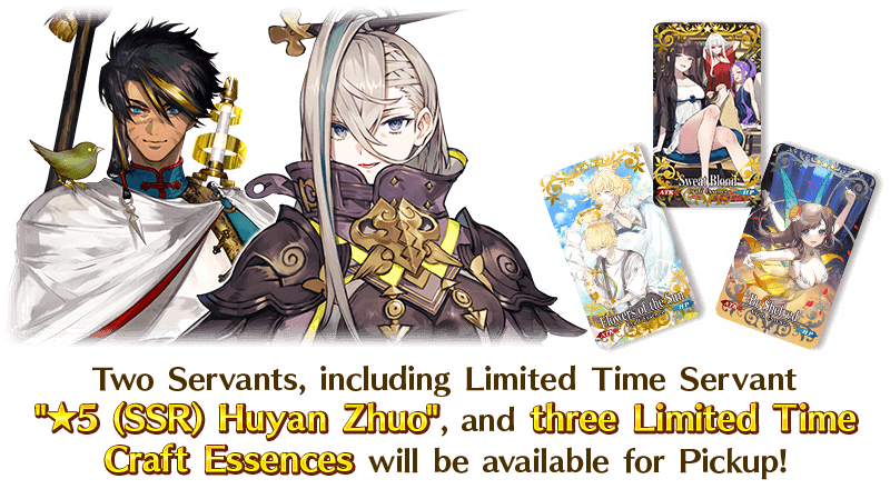 To celebrate the Limited Time Event "Mystic Eyes Symphony - The Bewitching Forest and Beautiful Footprints", two Servants, including a Limited Time Servant, and three Limited Time Craft Essences will be available for Pickup! * All Masters will be able to participate in the "Mystic Eyes Symphony Huyan Zhuo Pickup Summon", regardless of story progression.
