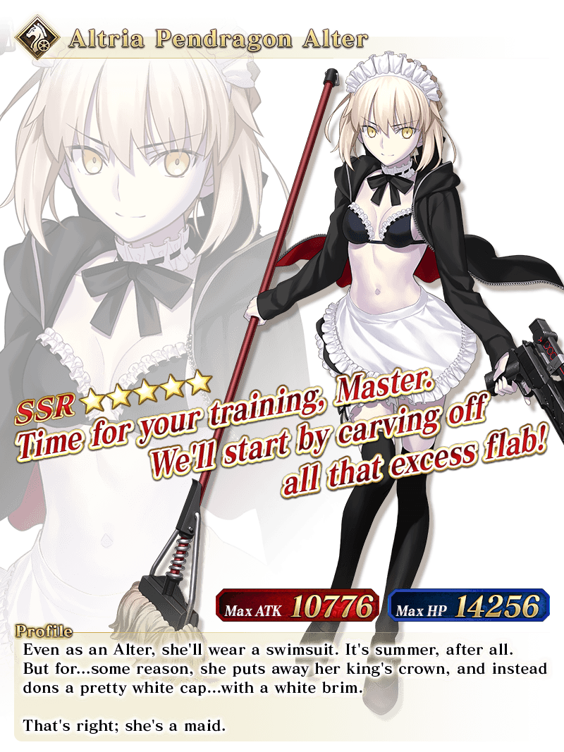 About Featured Servants: * The following Limited Time Servant(s) will only be summonable from the Summon Lineup(s) where they are featured as a Pickup Servant. In addition, they will not be added to Story Summon after the Pickup Summon period ends. - ★5 (SSR) Altria Pendragon Alter (Rider) * The following Story Summon Servant(s) will be summonable only from Story Summon and the Summon Lineup(s) where they are featured as a Pickup Servant. In the Summon Lineup(s) where they are featured as a Pickup Servant, they will be summonable even if they have not yet been added to Story Summon through story progression. No other Servants added to Story Summon through story progression will be summonable. - ★4 (SR) Altria Pendragon (Alter) (Saber) * The following Servant(s) will continue to be available through Story Summon after the Pickup Summon period ends. - ★4 (SR) Altria Pendragon (Alter) (Saber)