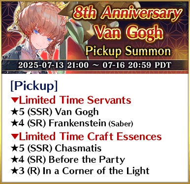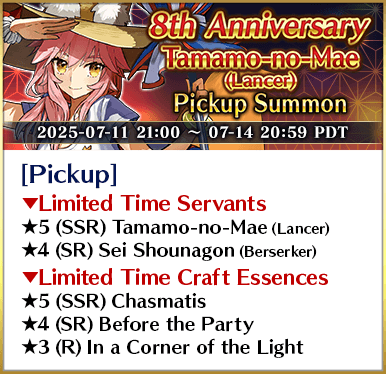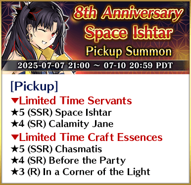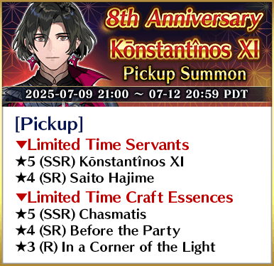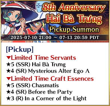 * The following Limited Time Servant(s) will only be summonable from the Summon Lineup(s) where they are featured as a Pickup Servant. In addition, they will not be added to Story Summon after the Pickup Summon period ends.