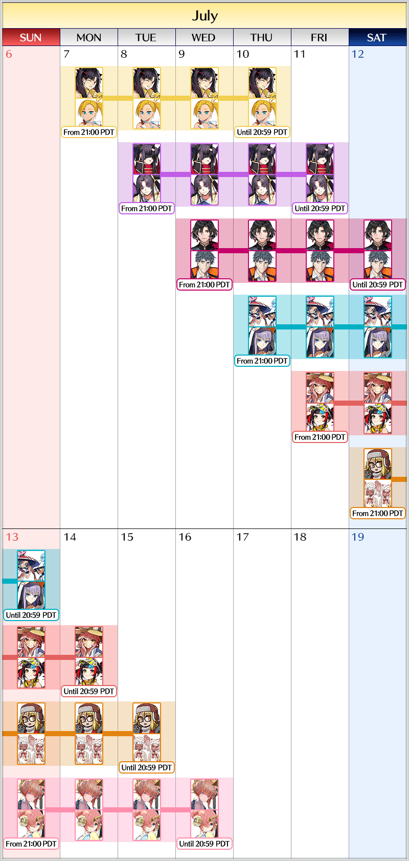 - If multiple Limited Time Pickup Summons are available at once, the number of summons you have performed will be counted individually for each Pickup Summon (each page on the Summon Screen). In addition, summons will be counted individually for each Summon Period that the Pickup Lineup changes for a Daily Pickup Summon. For example, in a Daily Pickup Summon where the Pickup Lineup changes each day at 21:00 PDT (GMT -7), your summon count will be reset at the moment the Pickup Lineup changes.