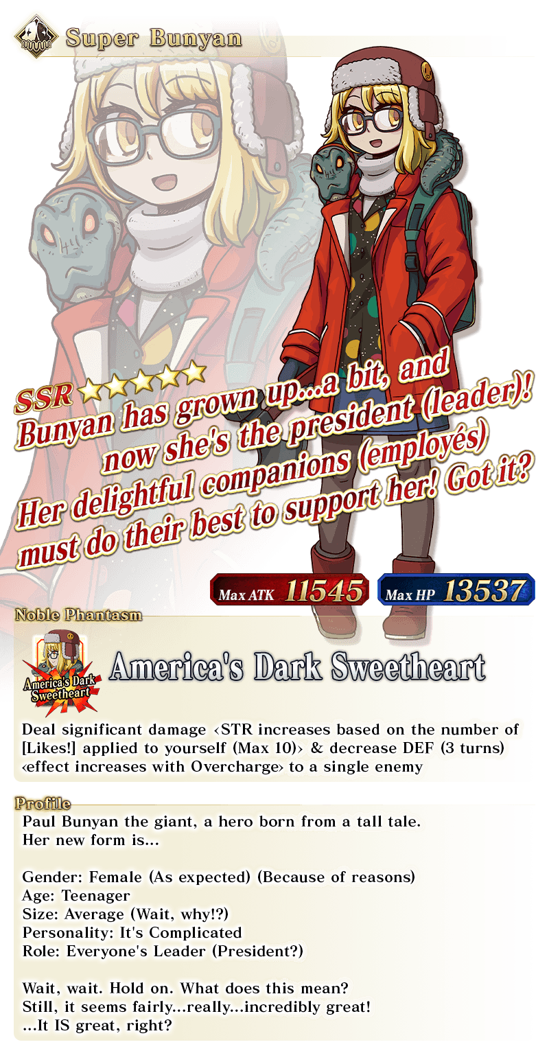 * The animations displayed for ★5 (SSR) Super Bunyan's Noble Phantasm will change based on Ascension stage.