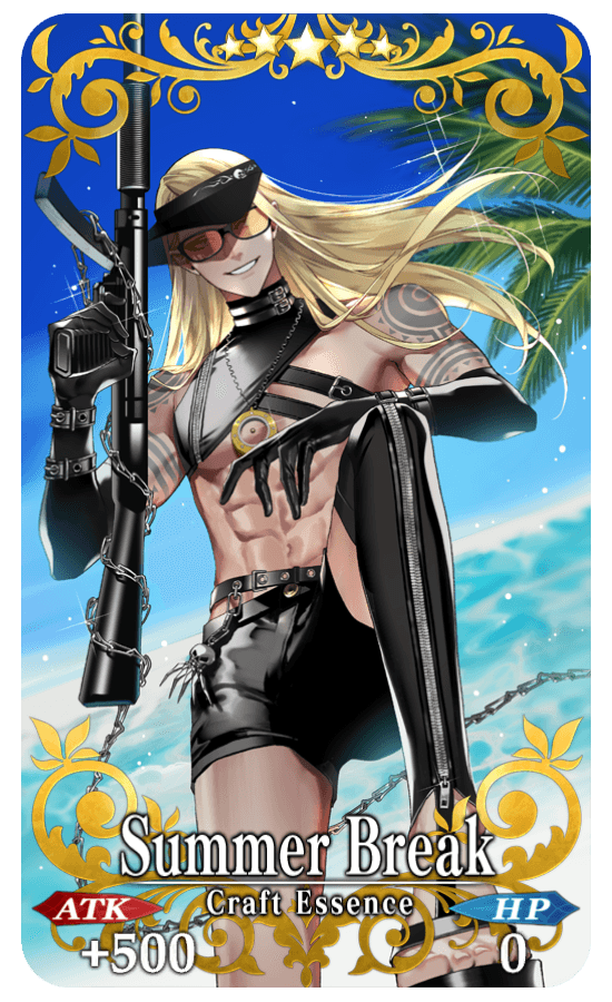 Limited Time Craft Essences - ★5 (SSR) Dazzling Moon - ★5 (SSR) Summer Break - ★4 (SR) Cactus City - ★4 (SR) Rounds Beach - ★3 (R) Beyond the Waves - ★3 (R) In Sickness and In Health