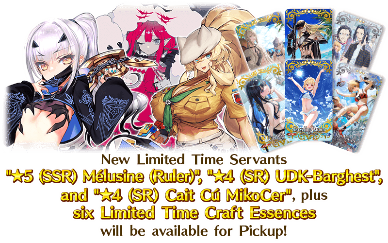 To go along with the Limited Time Event "Servant Summer Festival 2025!", new Limited Time Servants "★5 (SSR) Mélusine (Ruler)", "★4 (SR) UDK-Barghest", and "★4 (SR) Cait Cú MikoCer", and six Limited Time Craft Essences will be available for Pickup!