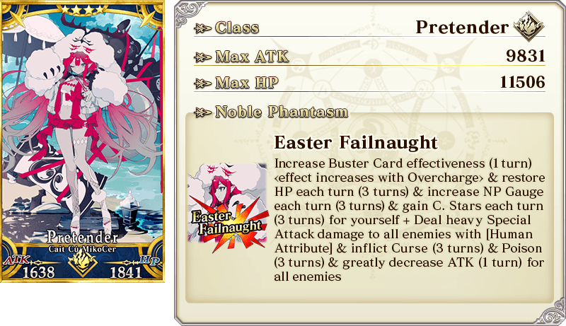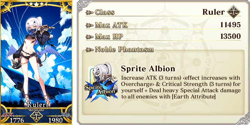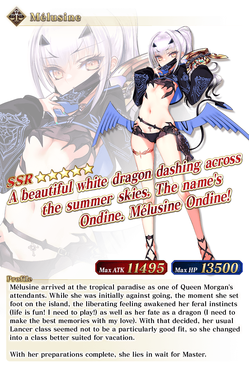 About Featured Servants: * The following Servant(s) will not be added to Story Summon after the Pickup Summon period ends. - ★5 (SSR) Mélusine (Ruler) - ★4 (SR) UDK-Barghest - ★4 (SR) Cait Cú MikoCer * Servants added to Story Summon through story progression will not be summonable. Please be sure to confirm the lineup before summoning.