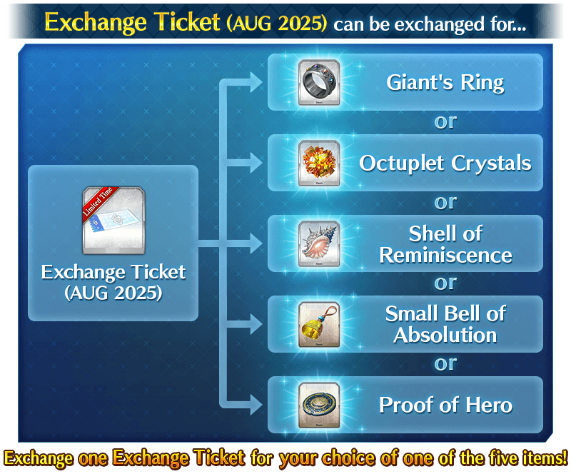 The "Exchange Ticket (AUG 2025)" available as a daily login bonus and daily mission rewards will be exchangeable for the following items.
