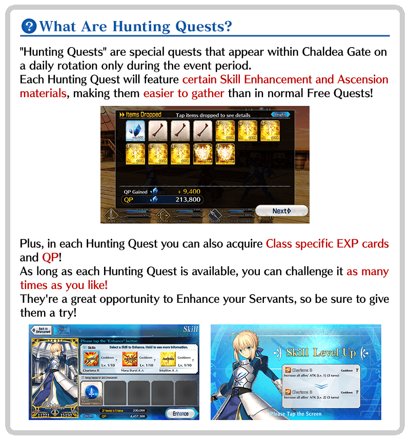 During the event period, a new Hunting Quest with a different enemy type will be unlocked daily within Chaldea Gate.