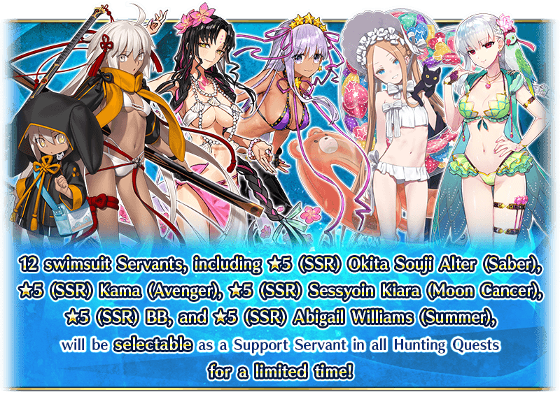 For a limited time during the period below, 12 swimsuit Servants, including ★5 (SSR) Okita Souji Alter (Saber), ★5 (SSR) Kama (Avenger), ★5 (SSR) Sessyoin Kiara (Moon Cancer), ★5 (SSR) BB, and ★5 (SSR) Abigail Williams (Summer), will be joining Hunting Quests as Support Servants!
