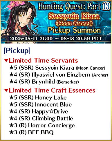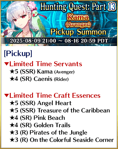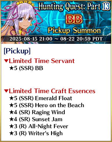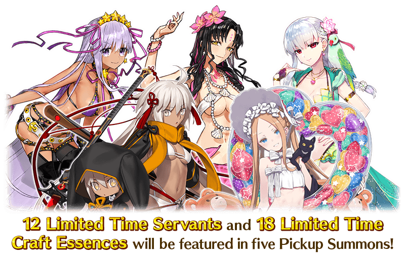 12 Limited Time Servants selected from among past swimsuit Servants and 18 Limited Time Craft Essences will be featured in five Pickup Summons to commemorate "Hunting Quest: Part 13"!