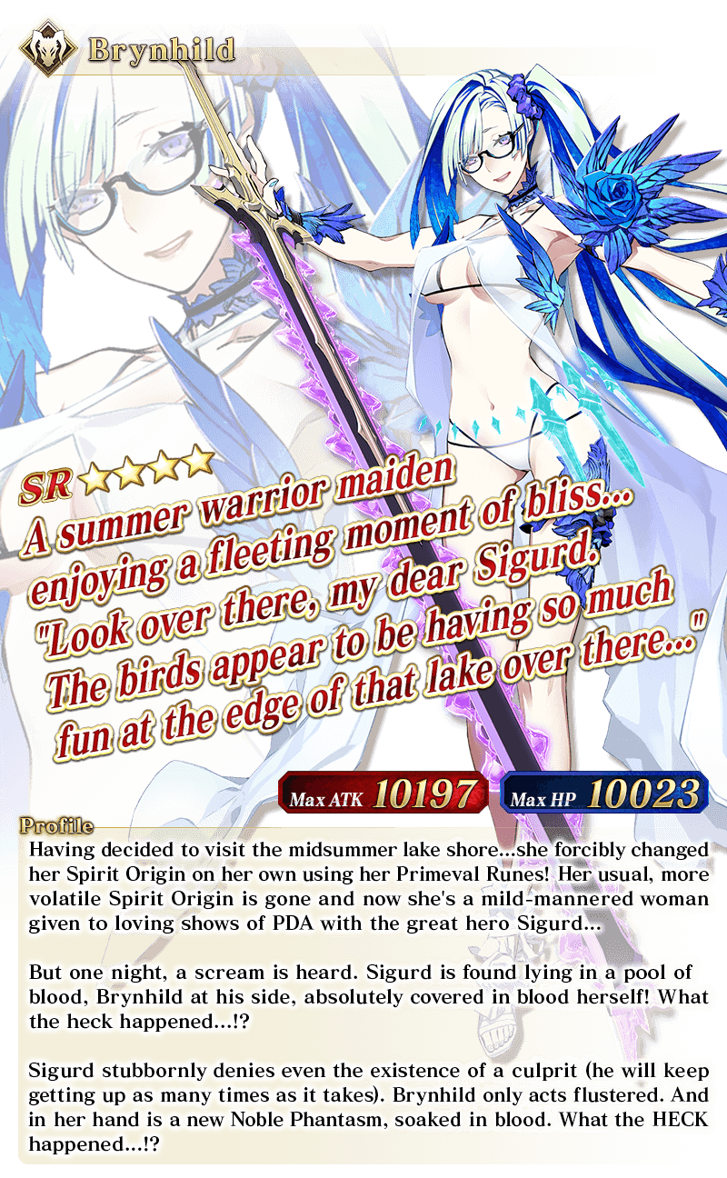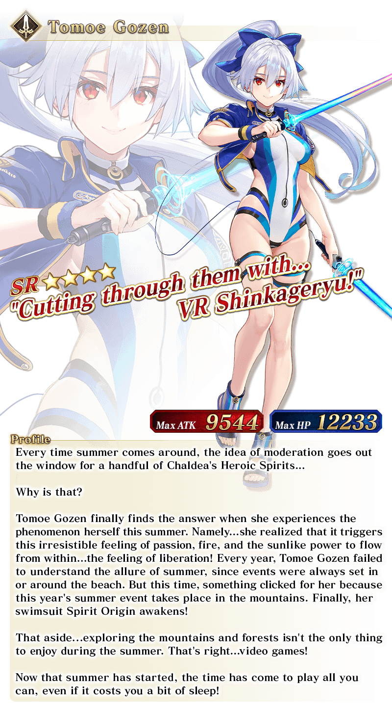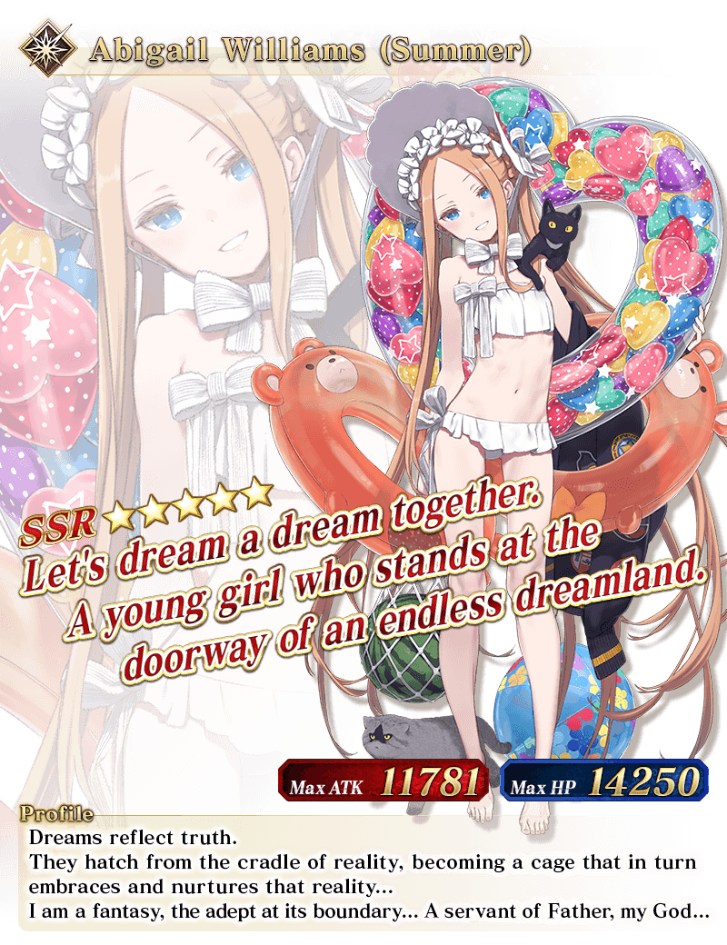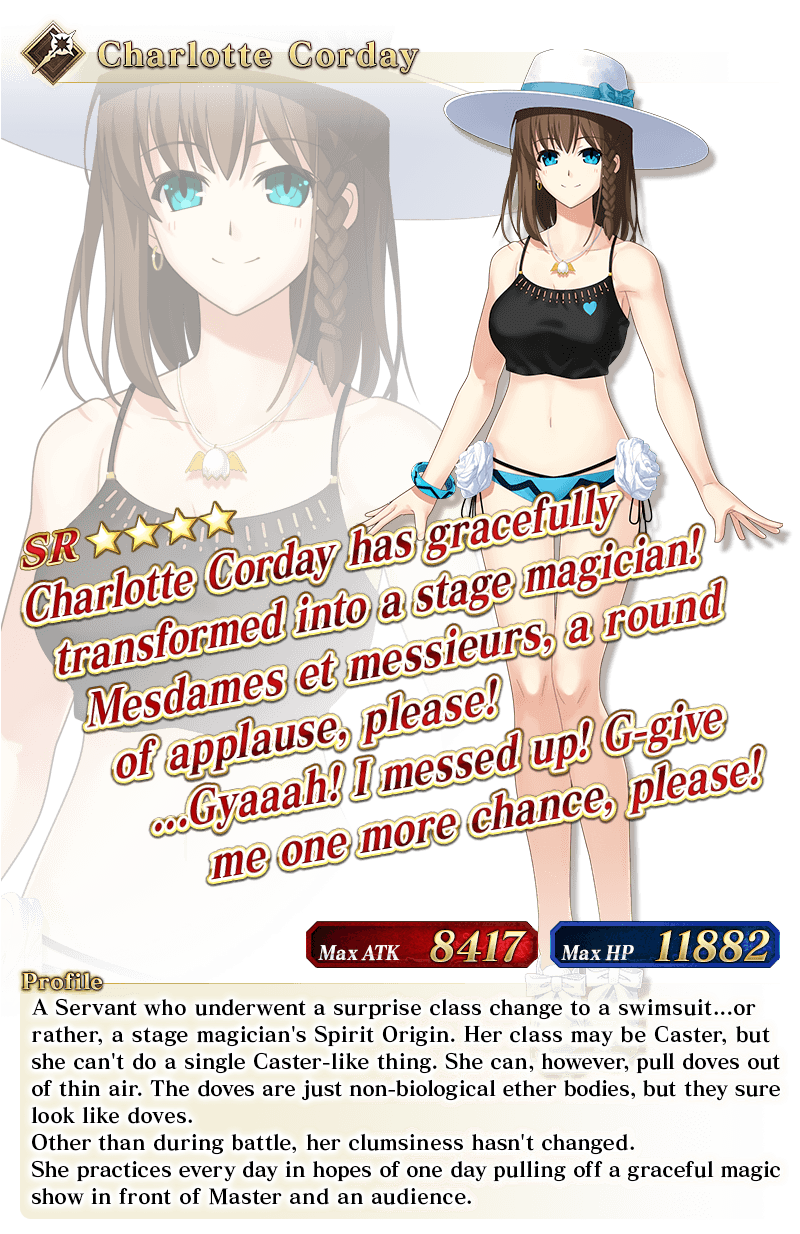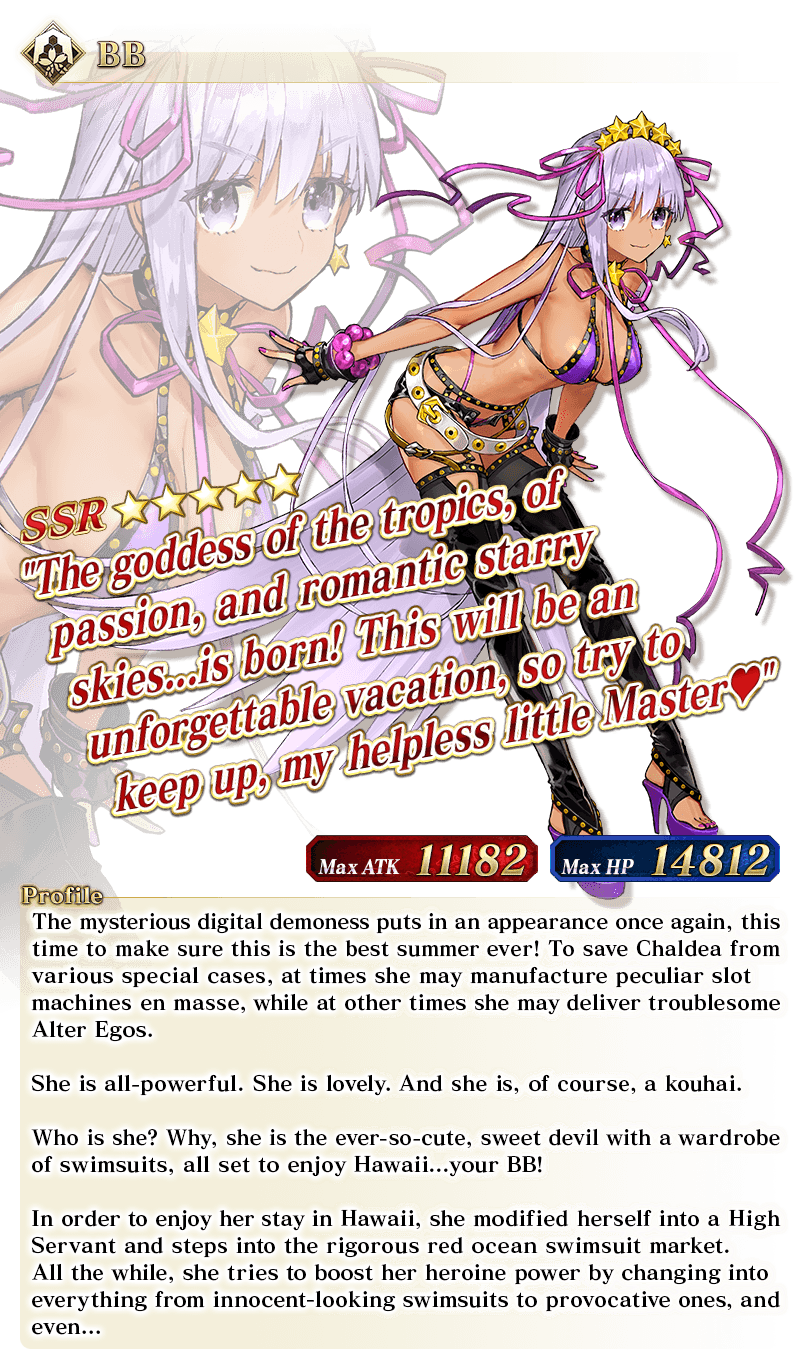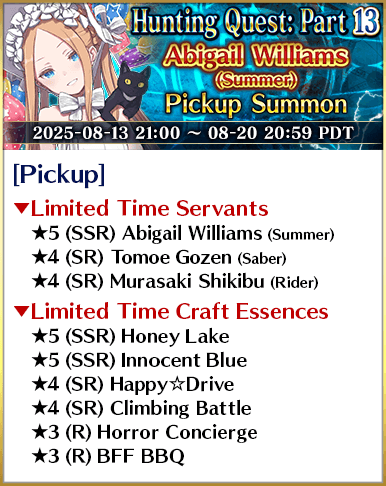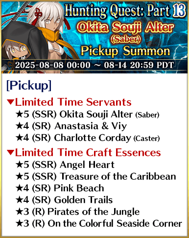 About Featured Servants: * The following Limited Time Servant(s) will only be summonable from the Summon Lineup(s) where they are featured as a Pickup Servant. In addition, they will not be added to Story Summon after the Pickup Summon period ends. - ★5 (SSR) Okita Souji Alter (Saber) - ★5 (SSR) Kama (Avenger) - ★5 (SSR) BB - ★5 (SSR) Sessyoin Kiara (Moon Cancer) - ★5 (SSR) Abigail Williams (Summer) - ★4 (SR) Tomoe Gozen (Saber) - ★4 (SR) Anastasia & Viy - ★4 (SR) Illyasviel von Einzbern (Archer) - ★4 (SR) Caenis (Rider) - ★4 (SR) Murasaki Shikibu (Rider) - ★4 (SR) Charlotte Corday (Caster) - ★4 (SR) Brynhild (Berserker) * Servants added to Story Summon through story progression will not be summonable. Please be sure to confirm the lineup before summoning.