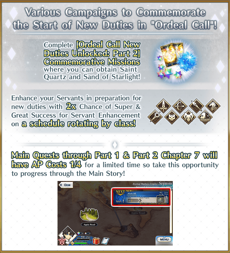 * Please note that Main Quest Part 2 Chapters 5.5 and 6.5, Pseudo-Singularities (I-IV), and Main Interludes will not be eligible. * As AP costs for the Main Quest through Part 2 Chapter 7 have been permanently halved, they will return to 1/2 costs following the end of this campaign.