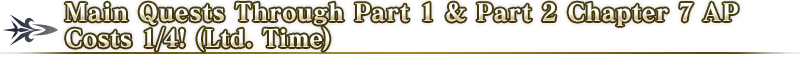 During the period below, Main Quests through Part 2 Chapter 7 will have AP costs reduced to 1/4! (AP costs will be reduced even if you withdraw from battle)