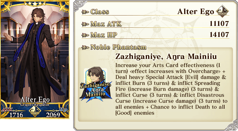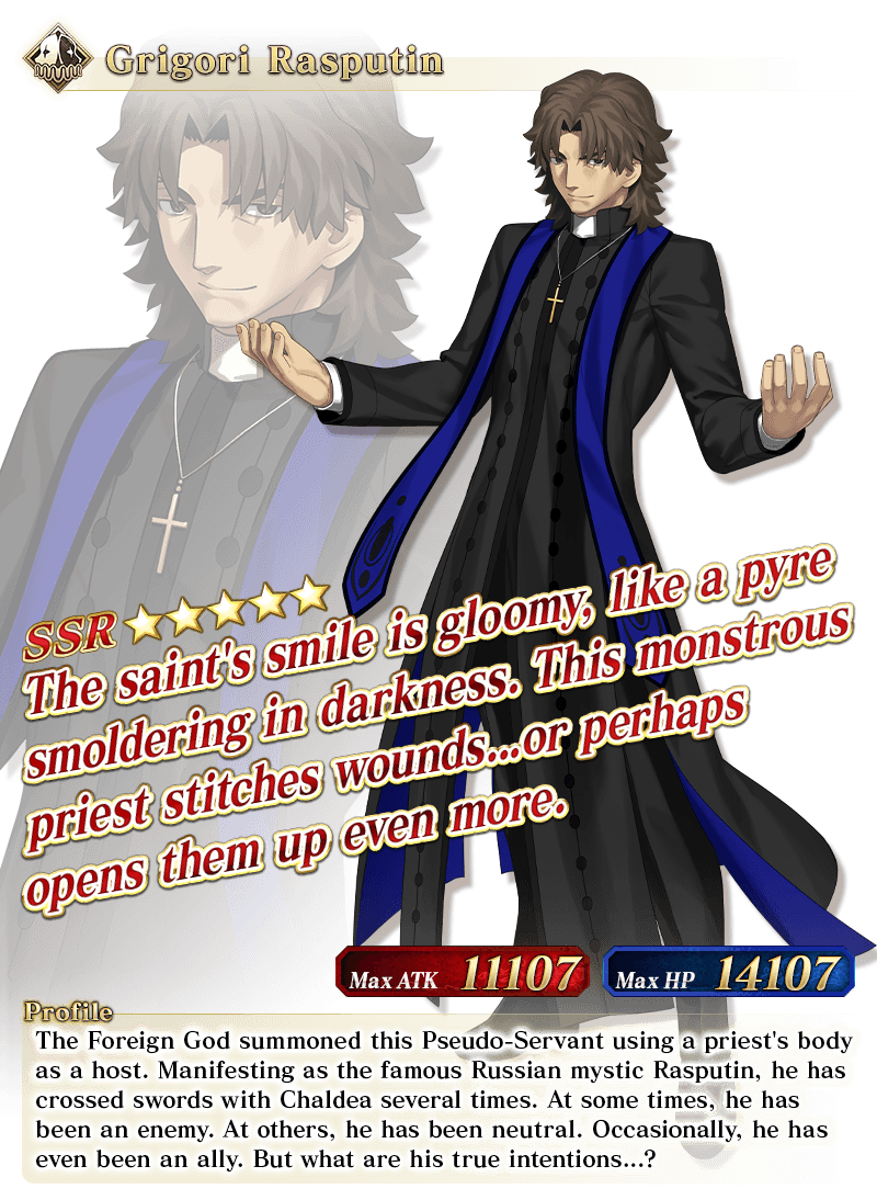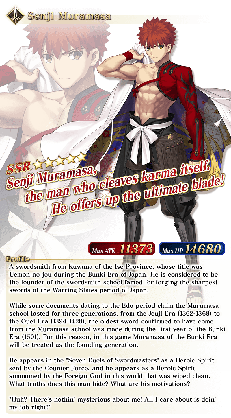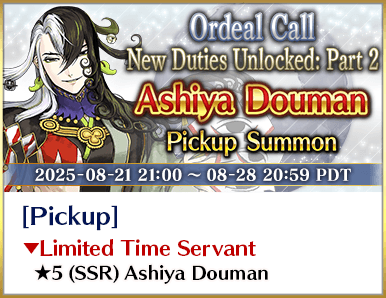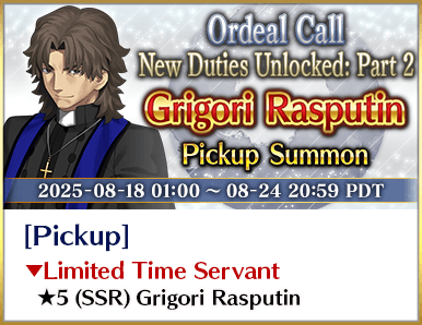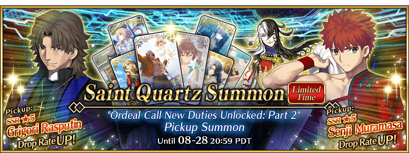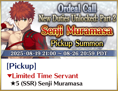 About Featured Servants: * The following Limited Time Servant(s) will only be summonable from the Summon Lineup(s) where they are featured as a Pickup Servant. In addition, they will not be added to Story Summon after the Pickup Summon period ends. - ★5 (SSR) Senji Muramasa - ★5 (SSR) Ashiya Douman - ★5 (SSR) Grigori Rasputin * Servants added to Story Summon through story progression will not be summonable. Please be sure to confirm the lineup before summoning.