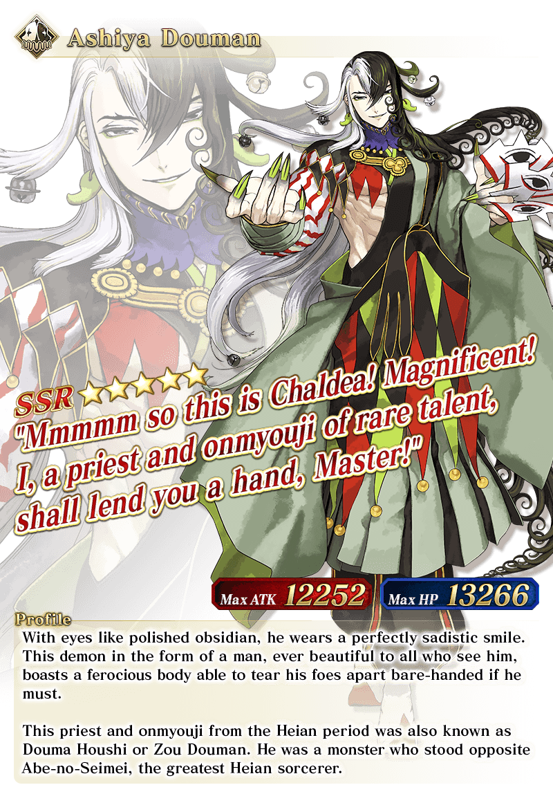 * The Spirit Origin Release Quest for ★5 (SSR) Ashiya Douman can be unlocked by raising him to Stage 3 Ascension.