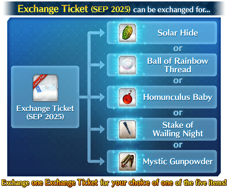 The "Exchange Ticket (SEP 2025)" available as a daily login bonus and daily mission rewards will be exchangeable for the following items.