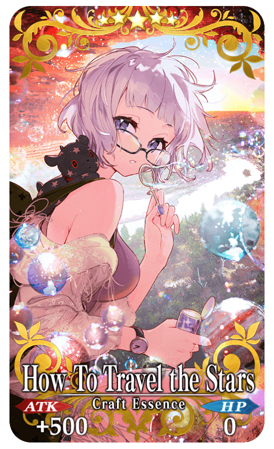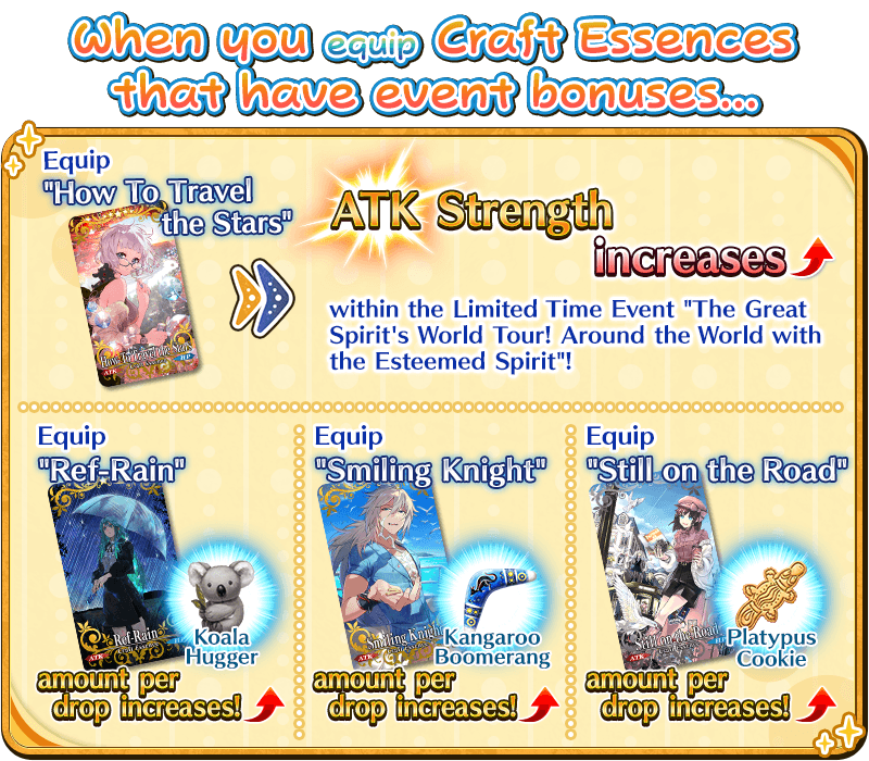 Equip the Event Limited Craft Essence "★5 (SSR) How To Travel the Stars", available through Event Item Exchange, to receive an ATK Strength Bonus within the Limited Time Event "The Great Spirit's World Tour! Around the World with the Esteemed Spirit".
