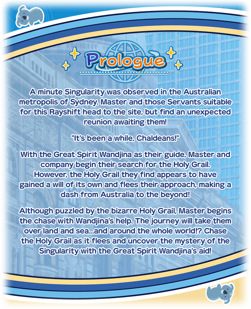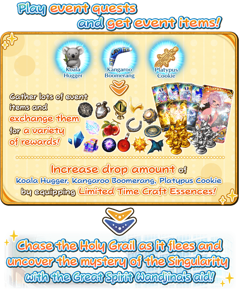 * The Simple Spiritron Dress "Wandjina Eye" Wardrobe Key will become exchangeable after clearing the Main Quest. * Crystallized Lore, Hero Crystal: Meteor Fou ALL ★4 (HP), and Hero Crystal: Corona Fou ALL ★4 (ATK) will become exchangeable after you clear a section of the event Main Quest that will be unlocked at a later date. * The following items will disappear at the end of the exchange period: Koala Hugger, Kangaroo Boomerang, and Platypus Cookie.
