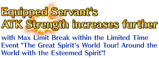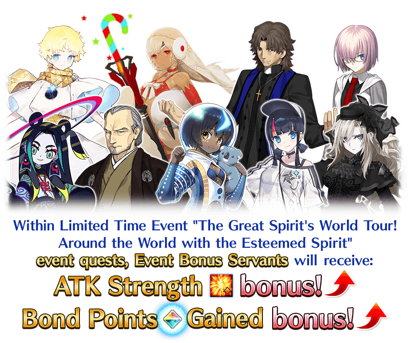 During the Limited Time Event "The Great Spirit's World Tour! Around the World with the Esteemed Spirit", certain Servants will gain an ATK Strength bonus and a Bond Points Gained bonus within event quests! * Bonus amounts will vary by Servant. * Mash Kyrielight's "Bond Points Gained" bonus is "Increase Bond Points gained for all allies, including sub-members". This bonus will not go into effect when selected as Support.
