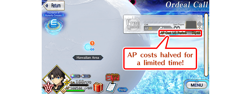 The Challenge Quest will remain available for the duration of the event period even after being cleared. Enjoy taking on this quest as many times as you like with different Servants and Craft Essences. * Quest Clear Rewards, battle drops, Master EXP, Mystic Code EXP, and Bond Points will only be awarded for the first clear.