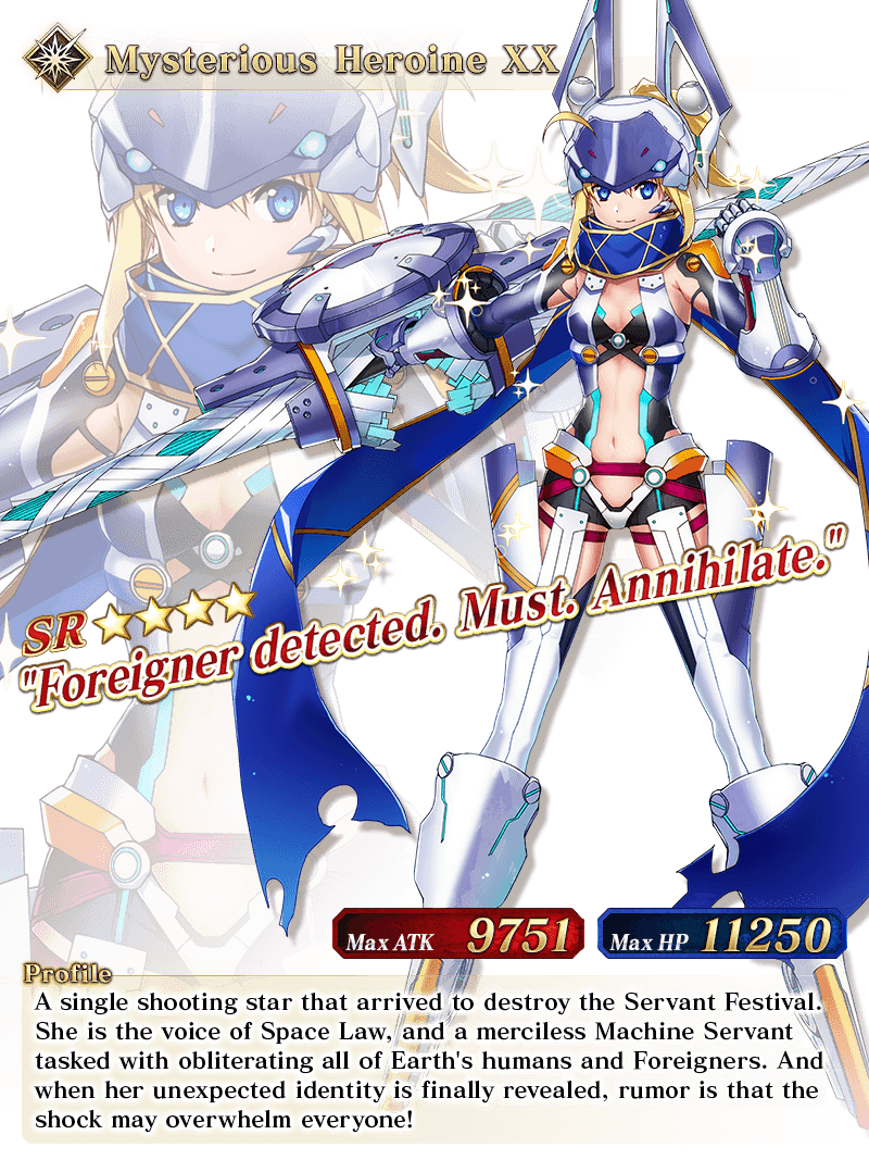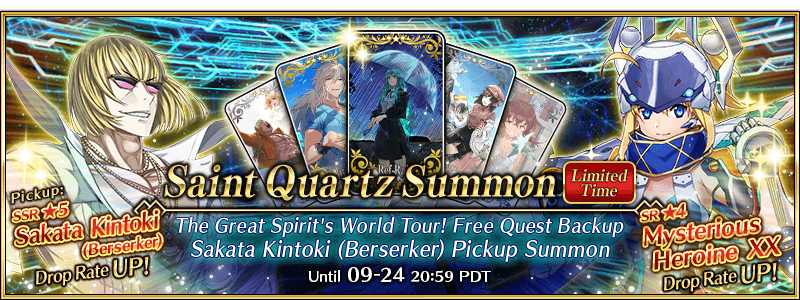 About Featured Servants: * The following Servant(s) will not be added to Story Summon after the Pickup Summon period ends. - ★5 (SSR) Sakata Kintoki (Berserker) - ★4 (SR) Mysterious Heroine XX * Please note that the Servant(s) available for Pickup in this Pickup Summon will not receive an ATK Strength bonus or a Bond Points Gained bonus within the Limited Time Event "The Great Spirit's World Tour! Around the World with the Esteemed Spirit". * Servants added to Story Summon through story progression will not be summonable. Please be sure to confirm the lineup before summoning.