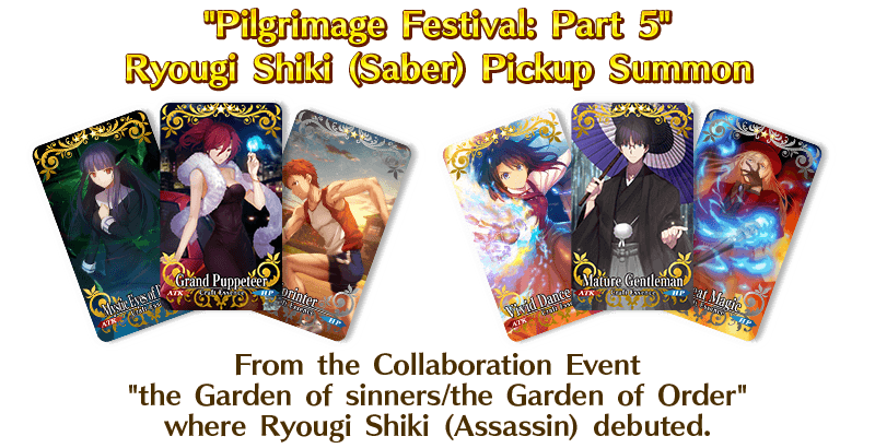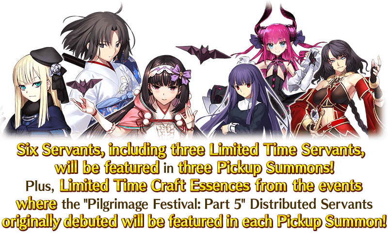 Six Servants, including three Limited Time Servants, who are related to the four Distributed Servants added in "Pilgrimage Festival: Part 5" will be available for Pickup in three Pickup Summons!
