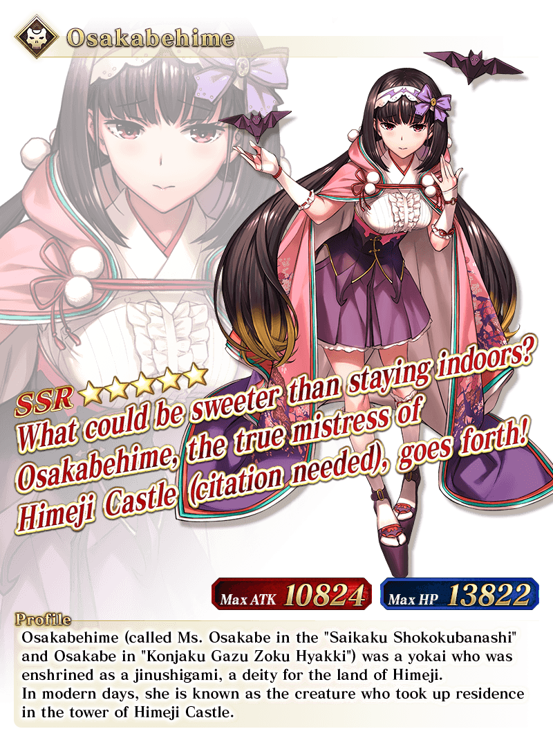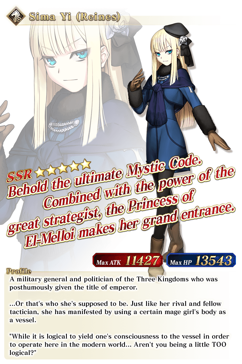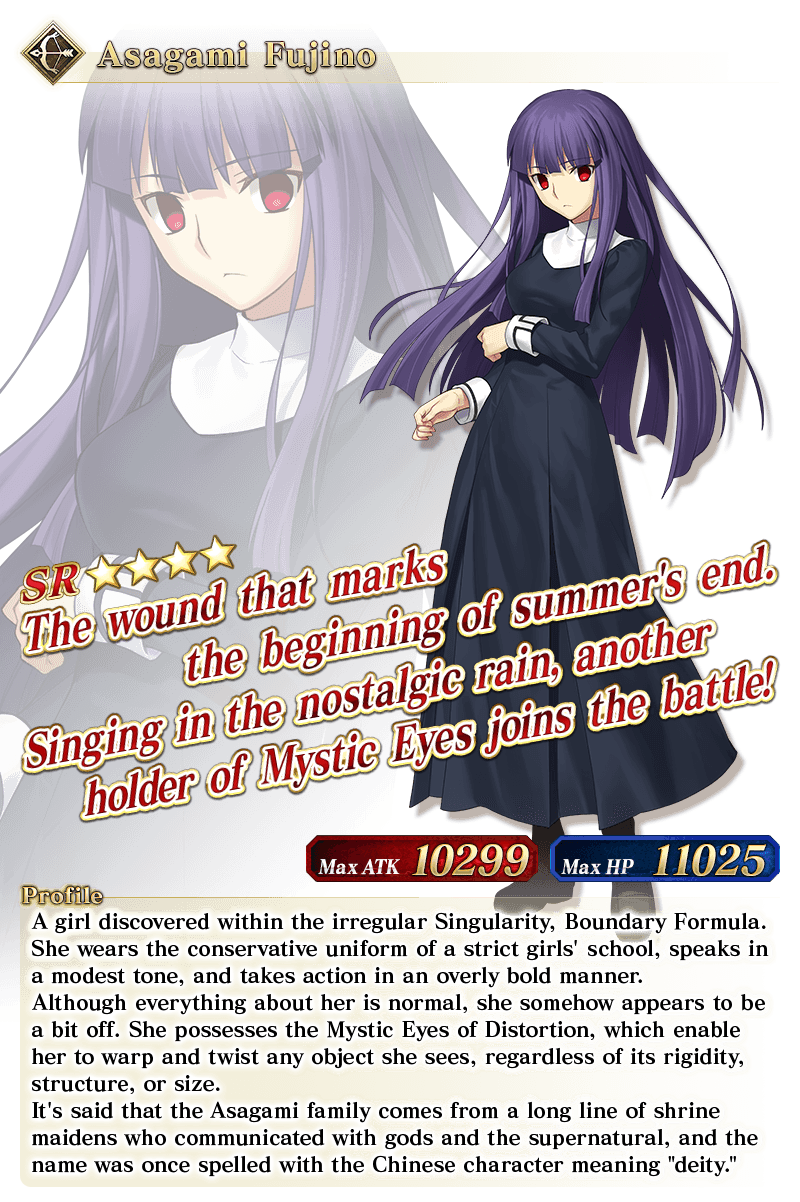 About Featured Servants: * The following Limited Time Servant(s) will only be summonable from the Summon Lineup(s) where they are featured as a Pickup Servant. In addition, they will not be added to Story Summon after the Pickup Summon period ends. - ★5 (SSR) Ryougi Shiki (Saber) - ★5 (SSR) Sima Yi (Reines) - ★4 (SR) Asagami Fujino * The following Servant(s) will continue to be available through Story Summon after the Pickup Summon period ends. - ★5 (SSR) Osakabehime (Assassin) - ★4 (SR) Elisabeth Báthory - ★4 (SR) Hephaistíon * Servants added to Story Summon through story progression will not be summonable. Please be sure to confirm the lineup before summoning.