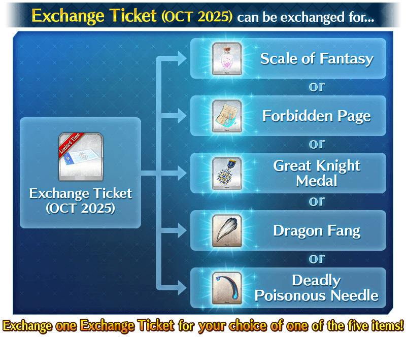 The "Exchange Ticket (OCT 2025)" available as a daily login bonus and daily mission rewards will be exchangeable for the following items.