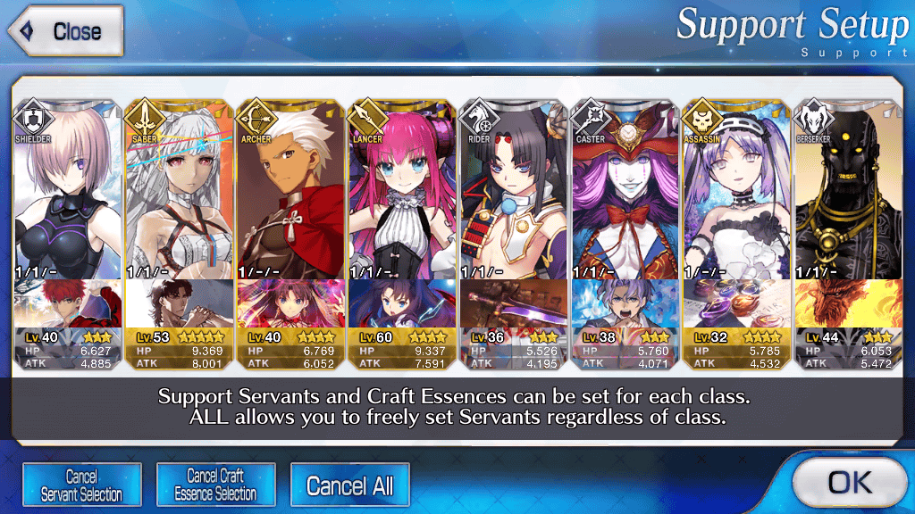 3. At the Support Setup screen, you can select Support Servants and Craft Essences for each Class.
